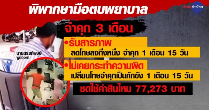 ศาลสั่งจำคุกมือตบพยาบาล 3 เดือน ไม่รอลงอาญา ปรับเงินอีกกว่า 70,000 บาท เจ้าตัวรับสารภาพ ศาลลดโทษให้เหลือกักขัง 1 เดือน 15 วัน
