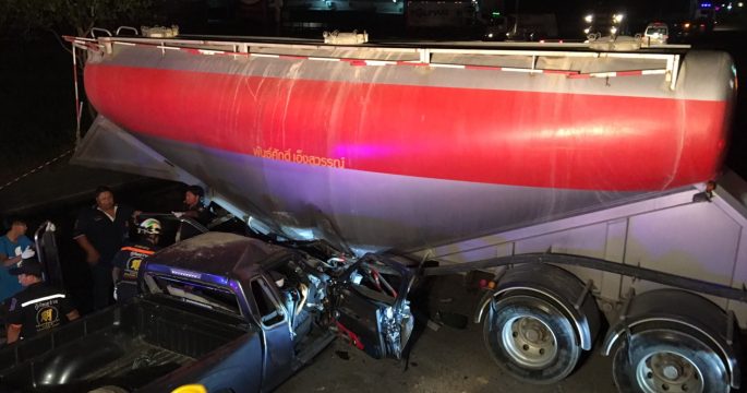 รถกระบะเบรคไม่อยู่ ชนอัดก๊อปปี้กลางลำรถเทรลเลอร์ เป็นเหตุให้คนในรถกระบะเสียชีวิตคาที่ 3 ศพ