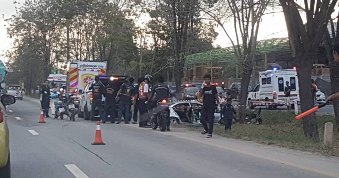 บีเอ็มซิ่งตกร่องกลางถนนสุขุมวิทอัดต้นไม้ ดับ 1 สาหัส 5 เหตุเกิดช่วงหลัก กม.ที่ 237 เยื้องทางเข้าวัดมาบจันทร์ ต.เพ อ.เมืองระยอง