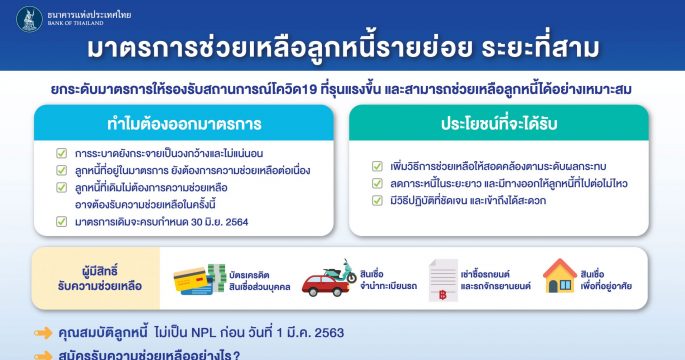 ธปท.ออกมาตรการช่วยลูกหนี้รายย่อยจากผลกระทบโควิด ระยะ 3 ทั้ง ขยายระยะเวลาชำระหนี้ พักหนี้ ลดดอกเบี้ย รวมหนี้ เริ่ม 17 พ.ค. นี้