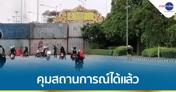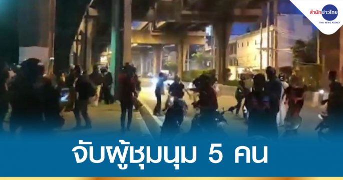 เจ้าหน้าที่เข้าเคลียร์พื้นที่บริเวณสามแยกดินแดง จับผู้ชุมนุมเป็นวัยรุ่น 5 คน และรถจักรยานยนต์ 2 คัน พร้อมระเบิดปิงปอง