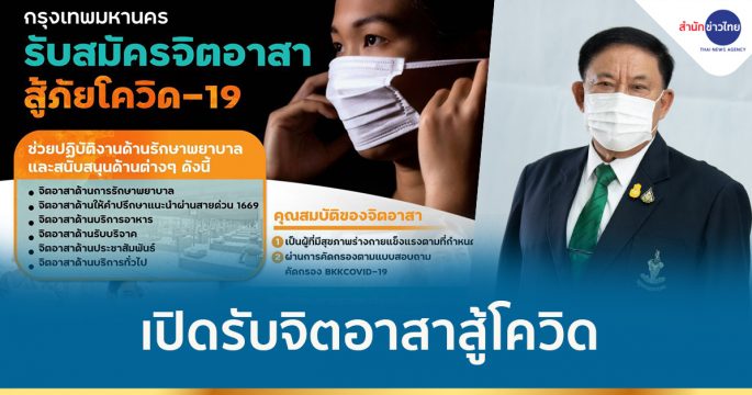 กทม.เปิดรับสมัครจิตอาสา ช่วยปฏิบัติงานด้านการรักษาพยาบาลและสนับสนุนด้านต่าง ๆ เพื่อควบคุมการแพร่ระบาดโรคโควิด-19 ในพื้นที่กรุงเทพฯ ให้อยู่ภายในวงจำกัดโดยเร็วที่สุด