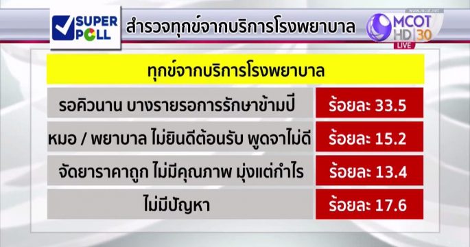 ผลสำรวจความคิดเห็นประชาชน เกี่ยวกับความทุกข์จากการบริการของโรงพยาบาล พบว่า ส่วนใหญ่ประสบกับปัญหารอคิวนาน รักษาพยาบาลนานข้ามปี รองลงมา คือ การให้บริการของหมอและพยาบาล