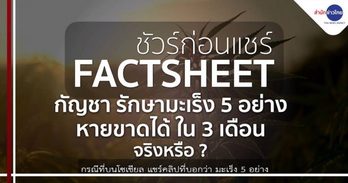 บนสังคมออนไลน์แชร์คลิปพร้อมข้อความเรื่องราวของชายคนหนึ่ง ป่วยมะเร็งรวม 5 อย่าง ใช้น้ำมันกัญชา และผลิตภัณฑ์กัญชา รักษาควบคู่กับแพทย์แผนปัจจุบัน อาการดีขึ้นจนหายขาด ภายในเวลา 3 เดือน ข้อเท็จจริงเรื่องนี้เป็นอย่างไร ? ติดตามจากศูนย์ชัวร์ก่อนแชร์
