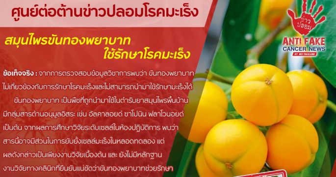 สถาบันมะเร็งฯ 23 มี.ค.-ตามที่มีกระแสข่าวทางสื่อออนไลน์ โดยระบุว่า “ขันทองพยาบาทรักษาโรคมะเร็งได้หายขาด” สถาบันมะเร็งฯ ตรวจสอบข้อเท็จจริงพบไม่เกี่ยวข้องกับการรักษาโรคมะเร็งและไม่สามารถนำมาใช้รักษามะเร็งได้ นายแพทย์สมศักดิ์ อรรฆศิลป์ อธิบดีกรมการแพทย์ กล่าวว่า ขันทองพยาบาท เป็นพืชที่ถูกนำมาใช้ในตำรับยาสมุนไพรพื้นบ้าน มีกลุ่มสารต้านอนุมูลอิสระ เช่น อัลคาลอยด์ ซาโปนิน ฟลาโวนอยด์ เป็นต้น จากผลการศึกษาวิจัยระดับเซลล์ในห้องปฏิบัติการ พบว่า สารนี้อาจมีส่วนในการยับยั้งเซลล์มะเร็งในหลอดทดลอง แต่ผลดังกล่าวเป็นเพียงงานวิจัยเบื้องต้น และยังไม่มีหลักฐานงานวิจัยทางคลินิกที่ยืนยันแน่ชัดว่าขันทองพยาบาทช่วยรักษาโรคมะเร็งในมนุษย์ นายแพทย์จินดา โรจนเมธินทร์ ผู้อำนวยการสถาบันมะเร็งแห่งชาติ กล่าวเสริมว่า การรักษาโรคมะเร็งหลัก ๆ มี 3 วิธี ได้แก่ การผ่าตัด การให้ยาเคมีบำบัด และรังสีรักษา การรับฟังข้อมูลที่ไม่ผ่านการพิจารณาหรือตรวจสอบข้อเท็จจริง อาจทำให้ประชาชนเข้าใจคลาดเคลื่อนและอาจลดโอกาสการรักษาทางการแพทย์ที่ได้มาตรฐาน ควรศึกษารายละเอียดด้านสรรพคุณ ฤทธิ์ทางเภสัชวิทยา และวิธีการใช้สมุนไพรอย่างถูกต้อง โดยเฉพาะผู้ป่วยโรคมะเร็งควรอยู่ภายใต้การดูแลของแพทย์ .-สำนักข่าวไทย