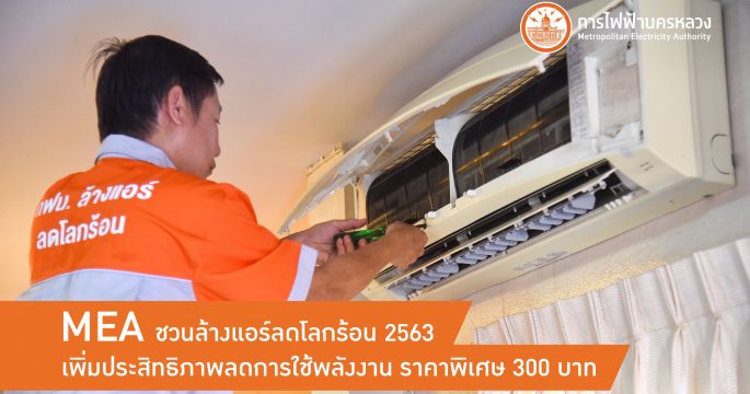 MEA เชิญชวนผู้ใช้ไฟฟ้าประเภทบ้านอยู่อาศัยและอาคารพาณิชย์ ร่วมโครงการ ล้างแอร์ลดโลกร้อนในราคาพิเศษเพียง 300 บาท โดยจะต้องมีการจ่ายค่าไฟฟ้าผ่าน e-Payment อย่างน้อย 1 ครั้ง