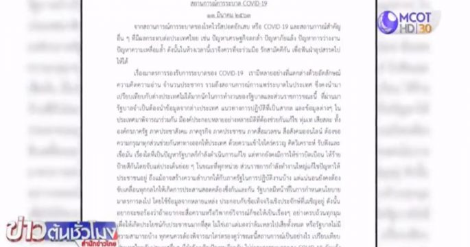 นายกรัฐมนตรี ออกสารสถานการณ์การระบาดโควิด-19 ขอความร่วมมือ อย่าตื่นตระหนก รักสามัคคีเพื่อฟันฝ่าวิกฤตนี้ไปให้ได้ วอนสื่อวิจารณ์ครบทุกมุม ไม่ใช่ล้มเหลวทั้งหมด ยืนยัน รัฐบาลและทุกหน่วยงานทำงานเต็มที่