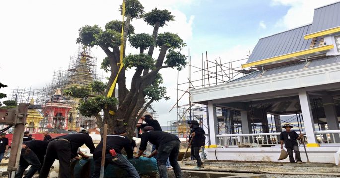 ทีมรุกขกร นำต้นตะโกพันธุ์ไม้ขนาดใหญ่ 22 ต้น ทยอยลงดิน ปลูกบริเวณศาลาลูกขุนทั้ง 4 มุม ประดับตกแต่งรอบพระเมรุมาศเป็นครั้งแรก คาดแล้วเสร็จภายในวันนี้