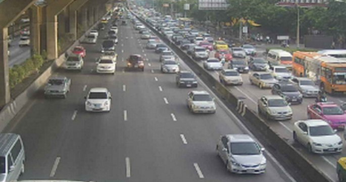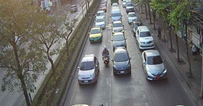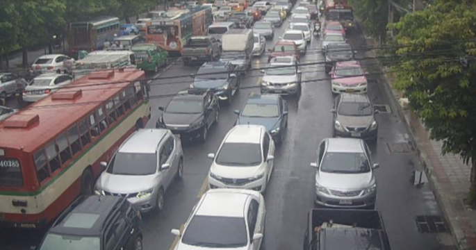 ถนนวิภาวดี ขาเข้า จากแยกสุทธิสาร มุ่งหน้าใต้ด่วนดินแดง รถมาก ยังเคลื่อนตัวได้ ขณะที่ถนนสุขุมวิท ขาออก ช่วงช้างสามเศียร มีน้ำท่วมขังผิวจราจร