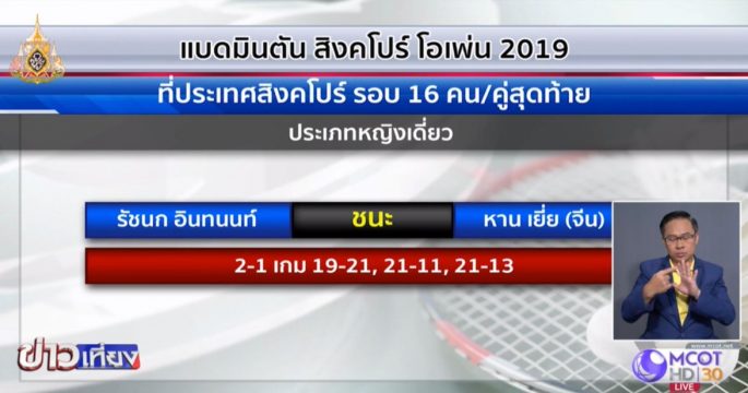 รัชนก อินทนนท์ มือ 8 ของโลก เอาชนะ โก๊ะ จินเหว่ย มือ 28 ของโลก จากมาเลเซีย 2 เกมรวด 21-16 และ 21-16 ผ่านเข้ารอบชิงชนะเลิศแบดมินตัน เปโรดัว มาเลเซีย มาสเตอร์ 2019
