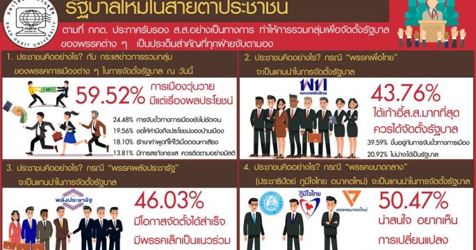 โพลพบประชาชนร้อยละ 59.52 ระบุการรวมกลุ่มของพรรคการเมืองในการจัดตั้งรัฐบาล ทำให้การเมืองวุ่นวาย ขณะที่ร้อยละ 52.53 แนะทางออกจัดตั้งรัฐบาลให้สำเร็จ ควรยึดหลักการ เป็นไปตามหลักประชาธิปไตย ปฏิบัติตามกฎมาย