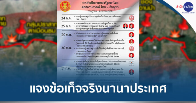 รัฐสภา 5 ส.ค.- รัฐสภาไทยจัดทำไทม์ไลน์รัฐสภาในการดำเนินงานต่อสถานการณ์ไทย-กัมพูชา ชี้แจงข้อเท็จจริงนานาประเทศ-ประณามกัมพูชา ตอบโต้ถ้อยแถลงฮุนเซน อันเป็นเท็จ รัฐสภาไทย ได้จัดทำโปสเตอร์ ไล่เลียงไทม์ไลน์การดำเนินงานของรัฐสภาไทย ต่อสถานการณ์ไทย-กัมพูชา ในช่วงเดือนกรกฎาคม ถึงสิงหาคม 2568 นับแต่วันที่เกิดเหตุปะทะกันของทหารไทยและกัมพูชาในวันที่ 24 กรกฎาคม สภาผู้แทนราษฎร มีการประชุมลับ เกี่ยวกับสถานการณ์ชายแดนไทย-กัมพูชา จากนั้น 25 กรกฎาคม นายนพดล อินนา สมาชิกวุฒิสภา แถลงประณามกัมพูชาในนาม IPU และนางสาวสรัสนันท์ อรรณพพร สส. พรรคเพื่อไทย ในฐานะประธานกรรมธิการการต่างประเทศ สภาผู้แทนราษฎร เข้าชี้แจงสถานเอกอัครราชทูตจีนโดยวันที่ 29 กรกฎาคม ประธานกรรมาธิการต่างประเทศ ยังเข้าชี้แจงสถานการณ์ต่อสถานเอกอัครราชทูตรัสเซีย และฝรั่งเศส วันที่ 30 กรกฎาคม นายวันมูหะมัดนอร์ มะทา ประธานรัฐสภา แถลงตอบโต้ประธานสภาแห่งชาติกัมพูชา ที่กล่าวถึงไทยบนเวที IPU ที่เจนีวา และมีหนังสือถึงประธาน IPU แจ้งถ้อยแถลงให้ประเทศสมาชิกรับทราบ นอกจากนั้นสมาชิกสภาผู้แทนราษฎร ยังได้ร่วมยืนไว้อาลัยแก่ผู้เสียชีวิตจากสถานการณ์ไทย-กัมพูชา […]
