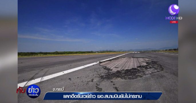 ชาวกระบี่ แตกตื่นรันเวย์ท่าอากาศยานนานาชาติกระบี่ มีรอยแตกร้าย 2 จุด ด้าน ผอ.ท่าอากาศยานนานาชาติกระบี่ เตรียมประชุมทีมวิศวกร วันที่ 5 มี.ค.นี้ วางแผนปิดซ่อมช่วงหลังเที่ยงคืนถึงเช้า เบื้องต้นยังไม่มีผลกระทบต่อเที่ยวบิน