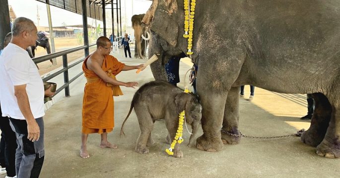 สวนนงนุชพัทยานิมนต์เกจิดังวัดสามัคคีบรรพตทำพิธีรับขวัญลูกช้างแรกเกิดเป็นสิริมงคล หลังแม่ช้างตกลูก 29 เม.ย. สมบูรณ์แข็งแรงดี พร้อมตั้งชื่อมงคล “พังมากมี” ขบวนกลองยาว-นางรำเพิ่มบรรยากาศสนุกสนาน