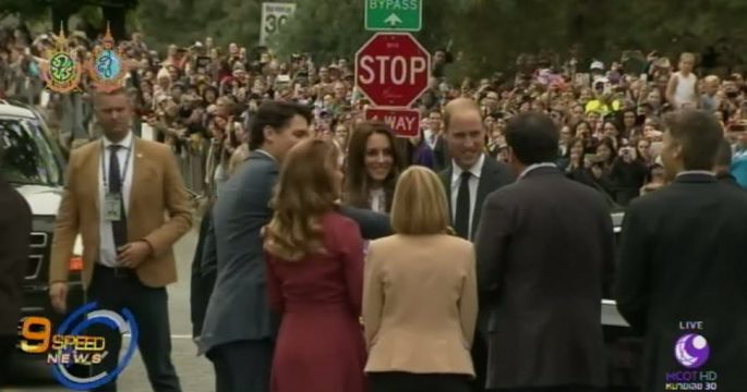 นายกรัฐมนตรีจัสติน ทรูโด ของแคนาดา และประชาชนจำนวนมาก รอรับเสด็จเจ้าชายวิลเลียม และเจ้าหญิงเคท ดยุคและดัชเชสแห่งเคมบริดจ์ของอังกฤษ