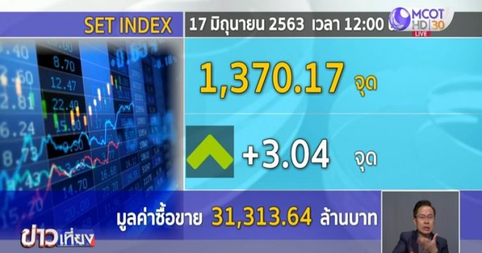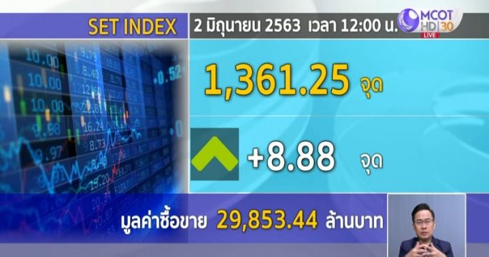 หุ้นไทยช่วงเที่ยง +8.88 จุด มูลค่าการซื้อขาย 29,853.44 ล้านบาท จากความหวังเศรษฐกิจจะฟื้นตัว หลังจากหลายประเทศ รวมทั้งไทย ผ่อนคลายมาตรการล็อกดาวน์เฟส 3