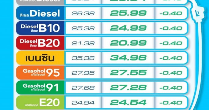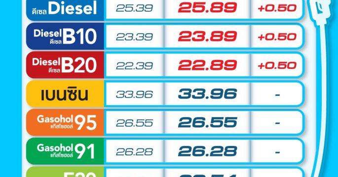กรุงเทพฯ 29 ต.ค. ราคาน้ำมันกลุ่มดีเซลปรับขึ้นพรุ่งนี้ 50 สตางค์/ลิตร ส่วนกลุ่ม เบนซิน ไม่เปลียนแปลง PTT Station และบางจากฯ ประกาศ ปรับราคาขายปลีกน้ำมันกลุ่มดีเซล ดีเซลพรีเมี่ยม ดีเซล B10 ดีเซล B20 เพิ่มขึ้น 0.50 บาทต่อลิตร นอกนั้นคงเดิม มีผล 30 ต.ค. 2562 เวลา 05.00 น. เป็นต้นไป โดยราคาขายปลีกของ PTT Station จะเป็นดังนี้ ULG = 33.96, GSH95 = 26.55, E20 = 23.54, GSH91 = 26.28, E85 = 19.49, ดีเซล = 25.89, ดีเซลพรีเมี่ยม = […]