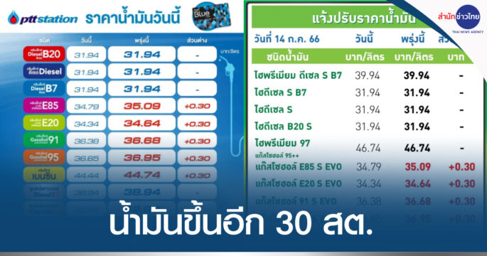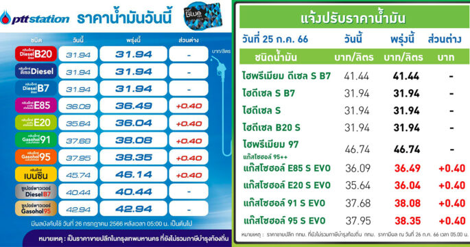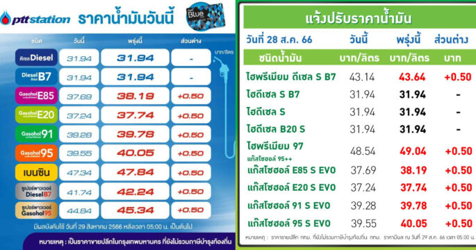 PTT Station-บางจากฯ ปรับราคาขายปลีกน้ำมันกลุ่มเบนซิน-แก๊สโซฮอล์ ทุกชนิดขึ้น 50 สตางค์/ลิตร ส่วนกลุ่มดีเซลคงเดิม มีผล 29 ส.ค.66 เวลา 05.00 น. เป็นต้นไป