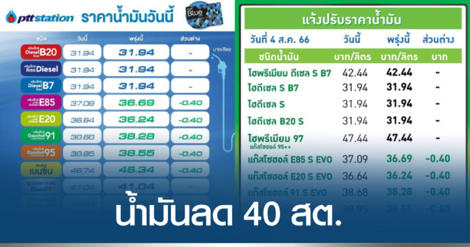 ผู้ค้าน้ำมันปรับลดราคาขายปลีกน้ำมันกลุ่มเบนซินและแก๊สโซฮอล์ทุกชนิดลง 40 สตางค์/ลิตร ส่วนกลุ่มดีเซลคงเดิม มีผลพรุ่งนี้ (5 ส.ค.66) เวลา 05.00 น. เป็นต้นไป