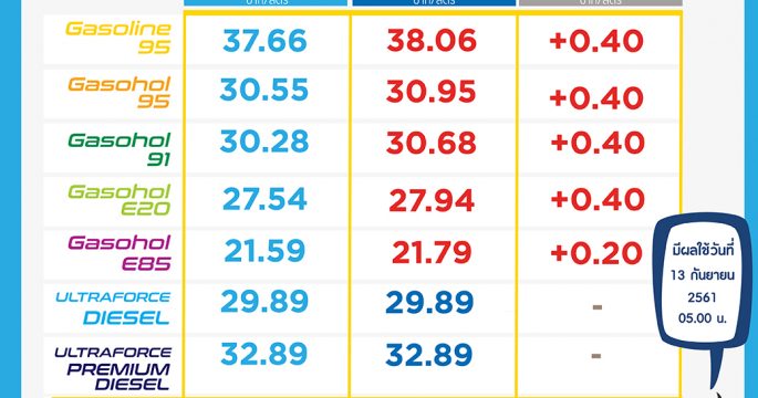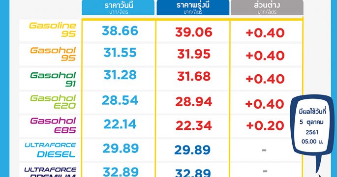 พรุ่งนี้ น้ำมันกลุ่มเบนซินและแก๊สโซฮอล์ทุกชนิดปรับขึ้น 40 สตางค์/ลิตร ส่วน E85 ปรับขึ้น 20 สตางค์/ลิตร