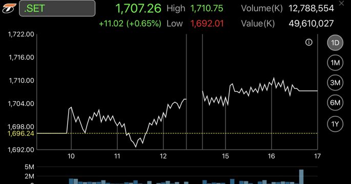 หุ้นไทยบวก 11.02 จุด จากราคาน้ำมันขึ้นหนุนกลุ่มพลังงาน ดัชนีปิดที่ 1,707.26 จุด ติดตามผลประชุม กนง.พรุ่งนี้