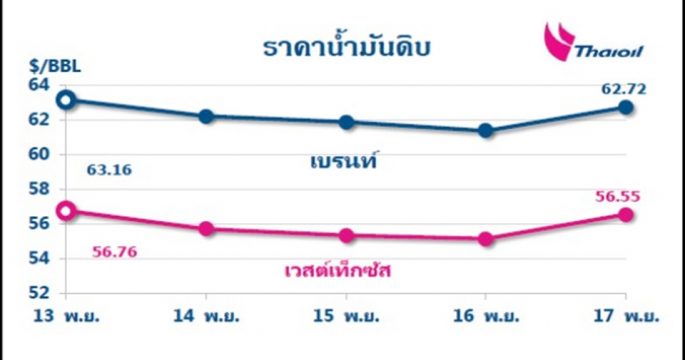 ไทยออยล์คาดราคาน้ำมันดิบเวสต์เท็กซัสสัปดาห์นี้ 53-58 เหรียญฯ ส่วนน้ำมันดิบเบรนท์ 60-65 เหรียญฯ/บาร์เรล