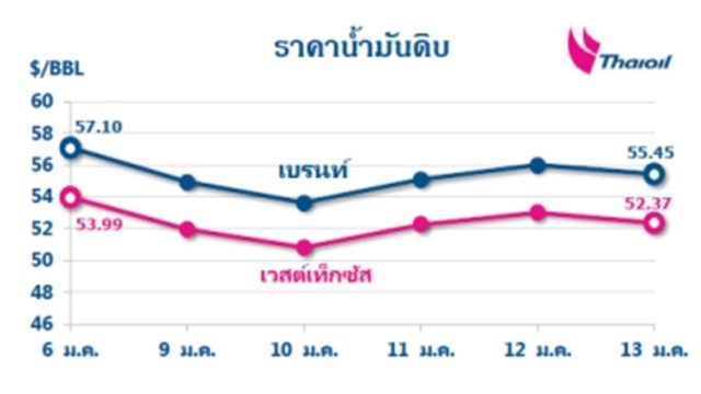 บมจ.ไทยออยล์คาดราคาน้ำมันดิบเวสต์เท็กซัสสัปดาห์นี้ 50 – 55 ดอลลาร์ฯ ส่วนน้ำมันดิบเบรนท์ 52-57 ดอลลาร์ฯ/บาร์เรล