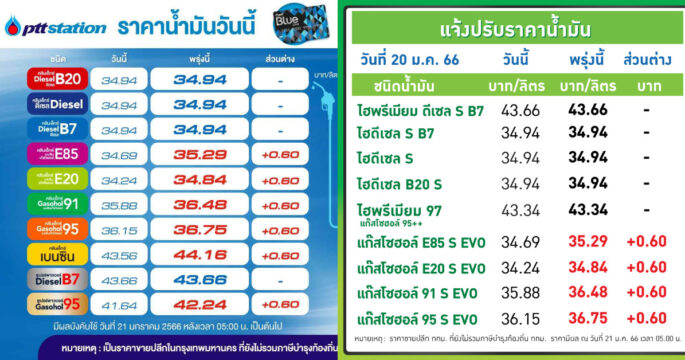 PTT Station -บางจากฯ ปรับราคาขายปลีกน้ำมันกลุ่มเบนซินและแก๊สโซฮอล์ทุกชนิดขึ้น 60 สตางค์/ลิตร มีผล 20 ม.ค. 2566 เวลา 05.00 น. เป็นต้นไป