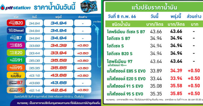 PTT Station-บางจากฯ ปรับราคาขายปลีกน้ำมันกลุ่มเบนซินและแก๊สโซฮอล์ทุกชนิดขึ้น 50 สตางค์/ลิตร มีผล 28 ก.พ. 2566 เวลา 05.00 น. เป็นต้นไป