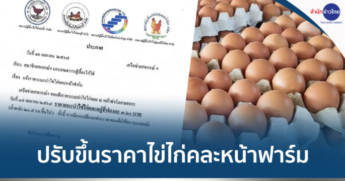 ไข่ไก่ปรับขึ้นอีกฟองละ 20 สตางค์​ มีผล 28 เม.ย.นี้ เหตุอากาศร้อนจัด ไก่ออกไข่​น้อยลง​ ประกอบกับก่อนหน้านี้​ไข่ราคา​ตก​ เกษตรกร​ปลดแม่ไก่ยืนกรง​ อุปทานที่ลดลงทำให้​ราคา​มีแนวโน้ม​จะปรับ​ขึ้น​อีก​ตามกลไกตลาด