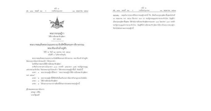เว็บไซต์ราชกิจจานุเบกษา เผยแพร่พระบรมราชโองการโปรดเกล้าฯ ให้ “พล.อ.อภิรัชต์” พ้นจากการปฏิบัติหน้าที่นายทหารพิเศษ เนื่องจากลาออกจากราชการ ขณะที่ “พ.อ.ม.จ.นวพรรษ์” ปรับโอนเข้ารับราชการในหน่วยบัญชาการถวายความปลอดภัยรักษาพระองค์