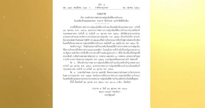 ราชกิจจาฯ เผยแพร่ประกาศยกเลิกประกาศสถานการณ์ฉุกเฉินที่มีความร้ายแรงในเขตท้องที่กรุงเทพฯ รวมทั้งข้อกำหนดและคำสั่งที่เกี่ยวข้อง มีผลแล้วตั้งแต่ 12.00 น. วันนี้