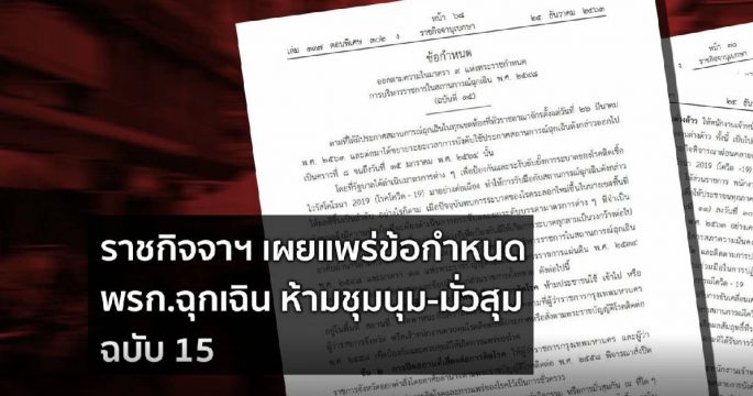 ราชกิจจานุเบกษา เผยแพร่ข้อกำหนด พ.ร.ก.ฉุกเฉิน คุมการระบาดของ “โควิด-19” ระลอกใหม่ โดยมีการห้ามเข้าพื้นที่เสี่ยง และทำกิจกรรมชุมนุมหรือมั่วสุม พร้อมให้ผู้ว่าฯ พิจารณาสั่งปิดสถานที่เสี่ยง