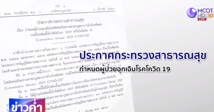 ราชกิจจานุเบกษา เผยแพร่ประกาศ ก.สาธารณสุข เรื่อง กำหนดผู้ป่วยฉุกเฉินโรคติดต่ออันตรายตามกฎหมายว่าด้วยโรคติดต่อ กรณีโรคติดเชื้อไวรัสโคโรนา 2019 หรือโรคโควิด-19
