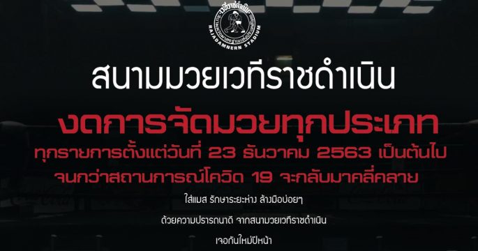 กทม. 22 ธ.ค. 63 – รายงานจากเฟซบุ๊ก Rajadamnern Stadium เวทีราชดำเนินสถานการณ์โควิด-19 ที่กลับมาระบาดอีกครั้ง สนามมวยเวทีราชดำเนิน ได้ประชุมกับทีมงานจิตรเมืองนนท์และทีมงานของสนามมวยสยามอ้อมน้อยแล้ว สรุปได้ว่าเพื่อความปลอดภัยของคนในวงการมวยรวมถึงภาพลักษณ์ของวงการมวยไทย สนามมวยเวทีราชดำเนิน จึงขอประกาศยกเลิกการจัดมวยทุกรายการตั้งแต่วันที่ 23 ธันวาคม 2563 เป็นต้นไป จนกว่าสถานการณ์โควิด-19 จะกลับมาคลี่คลาย อนึ่งสนามมวยราชดำเนิน จะกลับมาจัดมวยได้อีกเมื่อไหร่นั่น ขอให้ติดตามความคืบหน้าต่อไป .-สำนักข่าวไทย