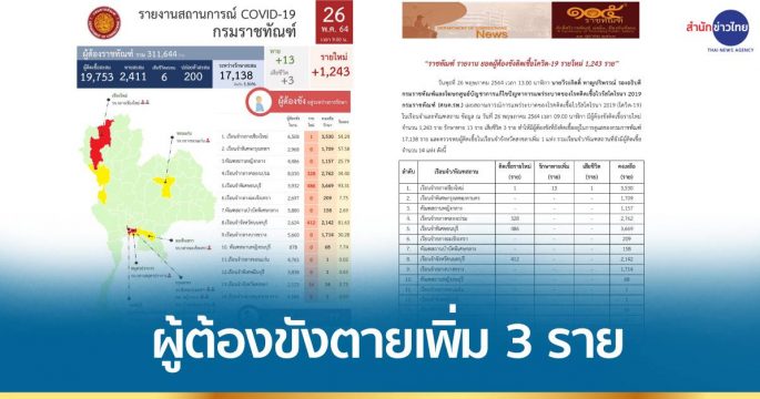 ราชทัณฑ์ รายงานยอดผู้ต้องขังติดเชื้อโควิด-19 รายใหม่ 1,243 ราย เสียชีวิตเพิ่ม 3 ราย และพบผู้ติดเชื้อในเรือนจำสงขลาเพิ่ม 1 แห่ง