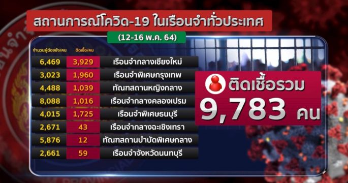 อธิบดีราชทัณฑ์แจงด่วนปิดทุกแดนในเรือนจำพิเศษกรุงเทพฯ ตั้งรพ.สนามที่เรือนจำกลางคลองเปรม แยกผู้ต้องขังติดเชื้อกว่า 2,800คน ให้ยาฟาวิพิราเวียร์ ฟ้าทะลายโจร และเร่งตรวจหาเชื้อซ้ำกับเอ็กซเรย์ปอดผู้ต้องขังทุกคน ขณะที่ “ไมค์ ระยอง” ผลยืนยันวันนี้ว่าติดเชื้อ ส่วน “รุ้ง” ราชทัณฑ์ยันคนร่วมแดนไม่มีติดเชื้อ