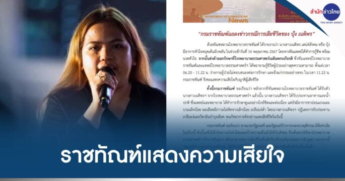 ราชทัณฑ์แถลงข่าวกรณี “บุ้ง เนติพร” เสียชีวิต พร้อมแสดงความเสียใจกับญาติ ยืนยันแพทย์-พยาบาลทำการรักษาอย่างใกล้ชิด รอผลชันสูตรหาสาเหตุและตั้งกรรมการตรวจสอบข้อเท็จจริงต่อไป
