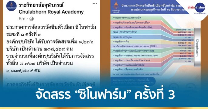 ราชวิทยาลัยจุฬาภรณ์ ประกาศการจัดสรรวัคซีนตัวเลือกซิโนฟาร์ม ระยะที่ 1 ครั้งที่ 3 องค์กร/บริษัท ได้รับการจัดสรรเพิ่ม 1,276 บริษัท เป็นจำนวน 338,419 คน