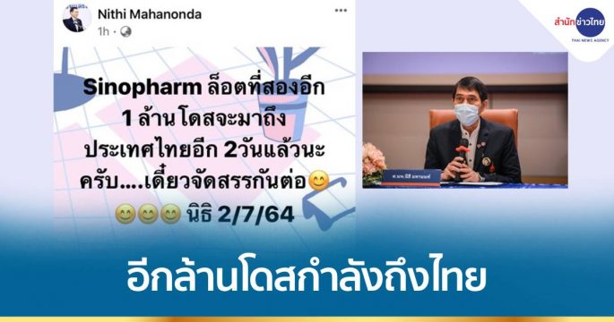 เลขาฯ ราชวิทยาลัยจุฬาภรณ์ โพสต์แจ้งข่าวดีอีก 2 วัน วัคซีน “ซิโนฟาร์ม” ลอต2 อีกจำนวน 1 ล้านโดส จะถึงไทย
