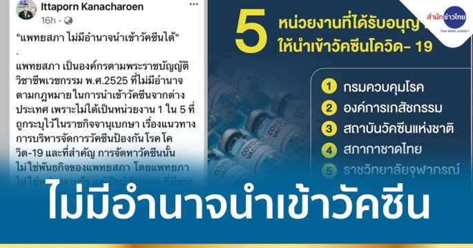 เลขาธิการแพทยสภา แจงปมข่าวนำเข้าวัคซีนไฟเซอร์ ย้ำแพทยสภาไม่มีอำนาจนำเข้าวัคซีนได้ มีเพียง 5 หน่วยงาน ที่ได้รับสิทธิตามประกาศในราชกิจจานุเบกษา “กรมควบคุมโรค- องค์การเภสัชฯ-สถาบันวัคซีนฯ-สภากาชาดไทย และราชวิทยาลัยจุฬาภรณ์”