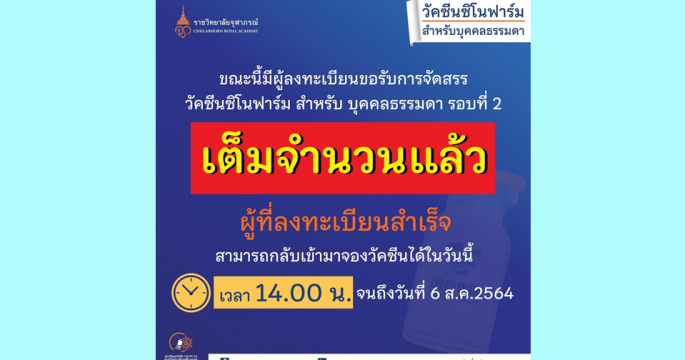 ราชวิทยาลัยจุฬาภรณ์ โพสต์เฟซบุ๊ก ขณะนี้การลงทะเบียนขอรับการจัดสรรวัคซีนซิโนฟาร์มสำหรับบุคคลธรรมดา รอบ 2 เต็มจำนวนแล้ว