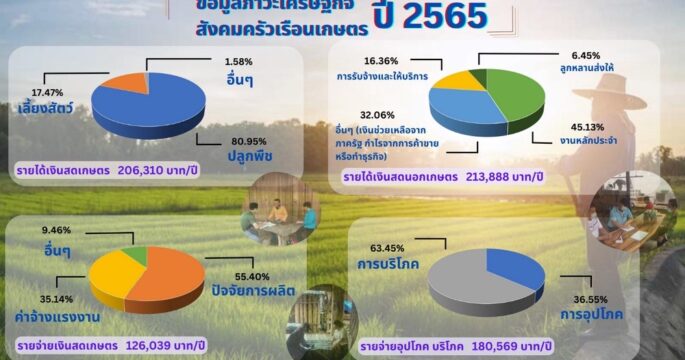 นายวินิต อธิสุข รองเลขาธิการสำนักงานเศรษฐกิจการเกษตร (สศก.) กระทรวงเกษตรและสหกรณ์ เปิดเผยถึงผลสำรวจภาวะเศรษฐกิจ สังคมครัวเรือนเกษตร ปีเพาะปลูก 2564/65 ซึ่งเป็นข้อมูลรายได้-รายจ่ายจากกิจกรรม ทั้งในและนอกภาคการเกษตรของเกษตรกรในช่วงเดือนพฤษภาคม 2564 ถึงเดือนเมษายน 2565 พบว่าครัวเรือนเกษตรทั่วประเทศ มีรายได้เงินสดทางการเกษตรเฉลี่ย 206,310 บาทต่อปี ส่วนใหญ่เป็นรายได้จากการปลูกพืช ร้อยละ 80.95 เลี้ยงสัตว์ ร้อยละ 17.47 และอื่นๆร้อยละ 1.58 นอกจากนี้ ยังมีรายได้จากกิจกรรมนอกการเกษตรเฉลี่ย 213,888 บาทต่อปี โดยเป็นรายได้หลักจากงานประจำ ร้อยละ 45.13 การรับจ้างและให้บริการ ร้อยละ 16.36 รายได้จากลูกหลานส่งให้ ร้อยละ 6.45 และอื่นๆ เช่น กำไรจากการค้าขายหรือทำธุรกิจ ได้รับเงินช่วยเหลือจากภาครัฐ เงินค่าเช่า ดอกเบี้ยเงินสะสม ฯลฯ ร้อยละ 32.06