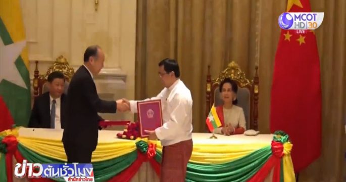 ประธานาธิบดีสี จิ้น ผิง ของจีน และ นางออง ซาน ซูจี มนตรีแห่งรัฐเมียนมา ร่วมเป็นสักขีพยานลงสนามข้อตกลง 33 ฉบับที่กรุงเนปิดอว์ ซึ่งเป็นส่วนหนึ่งของนโยบาย “หนึ่งแถบ หนึ่งเส้นทาง” วิสัยทัศน์สำคัญของจีนที่ต้องการรื้อฟื้นเส้นทางสายไหมในศตวรรษที่ 21