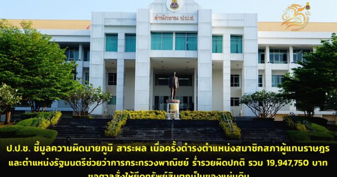 คณะกรรมการ ป.ป.ช. มีมติฟันอดีต ผอ.สำนักพุทธศาสนาแห่งชาติ ร่ำรวยผิดปกติเกือบ 600 ล้านบาท ส่งอัยการสูงสุดพิจารณายื่นฟ้องศาลศาลอาญาคดีทุจริตและประพฤติมิชอบ เพื่อยึดทรัพย์ให้ตกเป็นของแผ่นดิน