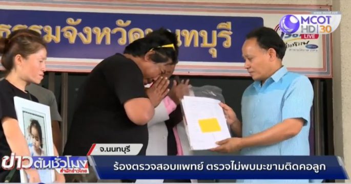 ครอบครัวเด็กหญิงวัย 2 ขวบ เข้าร้องศูนย์ดำรงธรรมนนทบุรี เอาผิดแพทย์โรงพยาบาล หลังตรวจไม่พบเม็ดมะขามติดคอลูก จนเด็กเสียชีวิตในที่สุด วอนหน่วยงานที่เกี่ยวข้องประสานนำศพไปตรวจพิสูจน์เพื่อหาข้อเท็จจริง