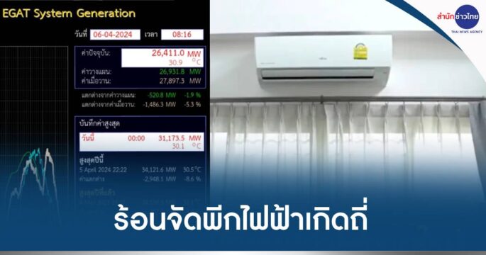 ร้อนจัด เมื่อวานนี้คนไทยใช้ไฟฟ้าสูงสุด 34,443.1 เมกะวัตต์ ทำลายสถิติสูงสุดของประเทศที่เคยเกิดขึ้นในปี 2566