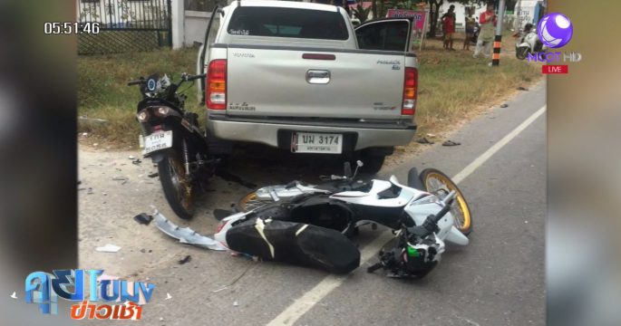 รถกระบะเสียหลักพุ่งชนรถจักรยานยนต์ นักเรียนวัย 15 ปี เสียชีวิต ส่วนเพื่อนที่มาด้วยกันบาดเจ็บสาหัส 2 คน