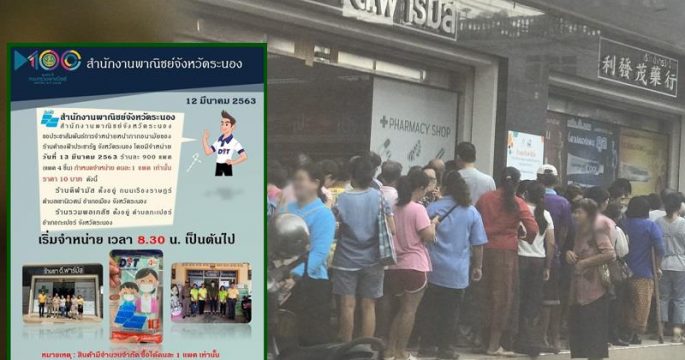 พรึบเดียวหมดใน 1 ชั่วโมง หน้ากากอนามัยธงฟ้าที่จังหวัดระนอง ประชาชนมาเข้าแถวรอแต่เช้าตรู่หน้าร้านธงฟ้าประชารัฐทั้ง 2 แห่ง
