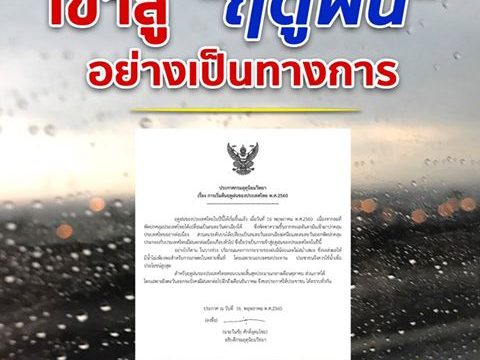 กรมอุตุฯ ประกาศเข้าสู่ “ฤดูฝน” อย่างเป็นทางการแล้ว โดยจะสิ้นสุดฤดูฝนประมาณกลางเดือนตุลาคม 2560 ส่วนภาคใต้ โดยเฉพาะฝั่งตะวันออก มีฝนต่อถึงเดือนธันวาคม 2560